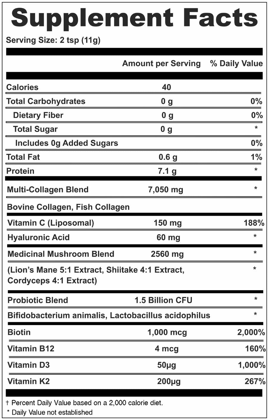 - 2560mg of Medicinal Mushrooms (Lion's Mane, Cordyceps & Shiitake Fruiting Body)